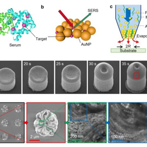 Загалом 100 зразків сироватки крові — 50 від пацієнтів з діагнозом раку щитовидної залози та 50 від здорових осіб — було зібрано з Банку матеріалів людського походження лікарні Янсан Пусанського національного університету. Для створення плазмонного субстрату дослідники поєднали AuNPs (діаметром 75 ± 5 нм), фізіологічний розчин та людську сироватку в гібридну рецептуру чорнила. Фізіологічний розчин був включений для зниження концентрації альбуміну, оптимізуючи умови для кластеризації AuNPs. Чорнило завантажували в мікропіпетку розміром 30 мкм, і осадження здійснювалося шляхом підтримки контакту з кремнієвою підкладкою до тих пір, поки випаровування розчинника не призводило до накопичення наночастинок та утворення кластерів. Енергетико-дисперсійна рентгенівська спектроскопія підтвердила наявність диспергованих AuNPs у висушених структурах, а також спостерігалися кристали хлориду натрію через вміст фізіологічного розчину.