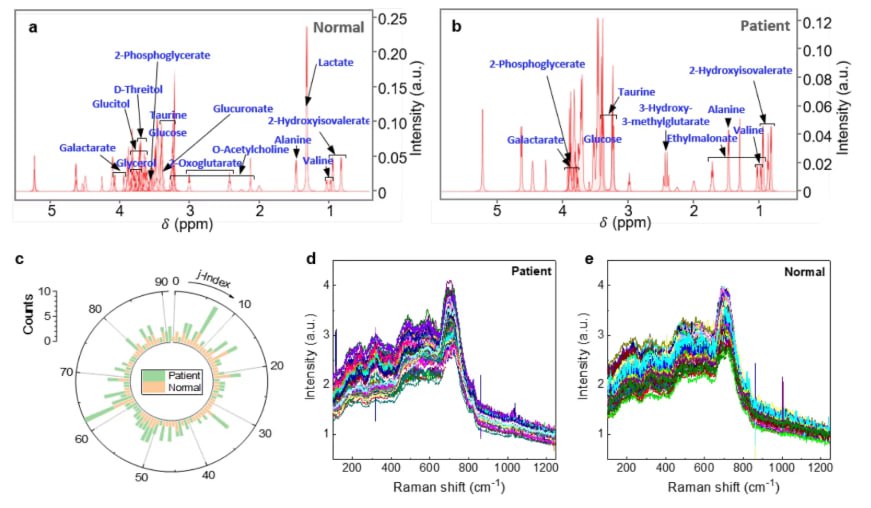 Кожен кластер утворював локалізовані електромагнітні гарячі точки завдяки взаємодії AuNPs. Ці гарячі точки посилювали раманівський сигнал сусідніх метаболітів. Команда записала SERS-спектри за допомогою портативного раманівського спектрометра з лазером 633 нм при потужності 1,8 мВт та 2,0 мВт протягом чотирьох тривалостей експозиції: 500 мс, 1000 мс, 2000 мс та 3000 мс. Загалом було зібрано 800 спектрів, по 400 з кожної групи. Вимірювання проводилися в діапазоні раманівського зсуву від 200 до 1200 см⁻¹, а спайковий шум видалявся перед аналізом; додаткова спектральна фільтрація не застосовувалася. Повторюваність була підтверджена шляхом виконання п'яти вимірювань на зразок, що підтверджує узгодженість спектральних профілів у сироватці крові кожної людини.