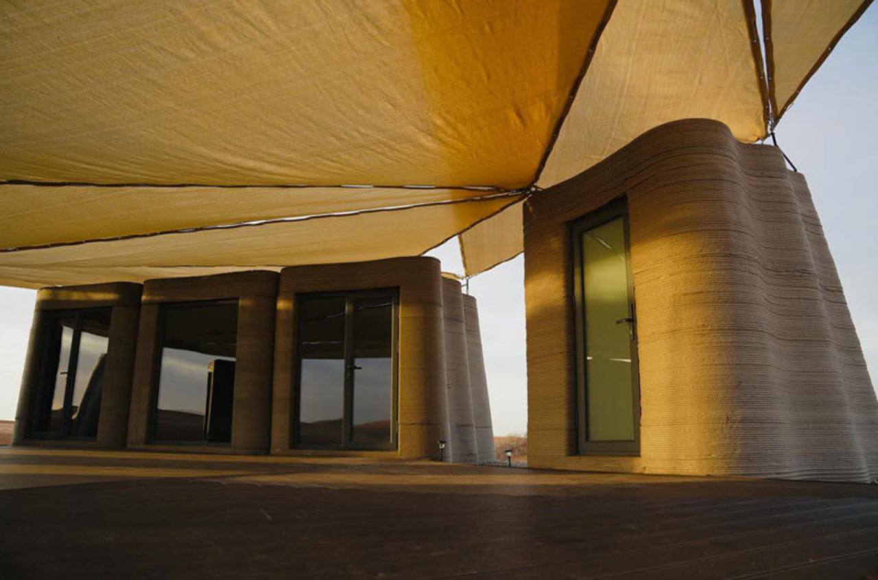 Модулі виготовляються з 3D-друкованого бетону, основним компонентом якого є суміш на основі піску, що матеріально та візуально поєднується з навколишніми дюнами. Хвилясті форми блоків мінімізують опір вітру, а текстурована друкована поверхня відображає природні візерунки ландшафту. Кожен блок розташований безпосередньо на піску та стабілізується завдяки власній вазі, уникаючи глибоких фундаментів та забезпечуючи можливість реверсивного будівництва для майбутнього переміщення. Дерев'яна тераса, що підтримується зв'язаними сталевими трубами та повторно використаними вантажними піддонами, створює безперервну платформу, яка ніби ширяє над землею, що ще більше зменшує вплив на навколишнє середовище.